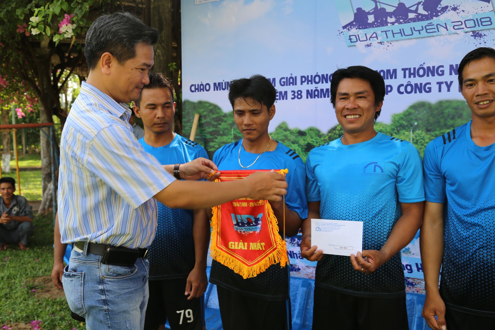 Ông Nguyễn Văn Minh - Chủ tịch Công Đoàn Các Doanh nghiệp Công ích và Dịch vụ Thương mại Thành phố trao cờ vô địch cho đội đua thuyền Xí nghiệp XLNT Bình Hưng Hòa