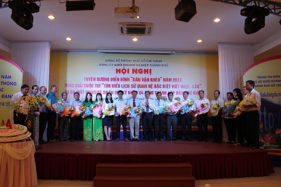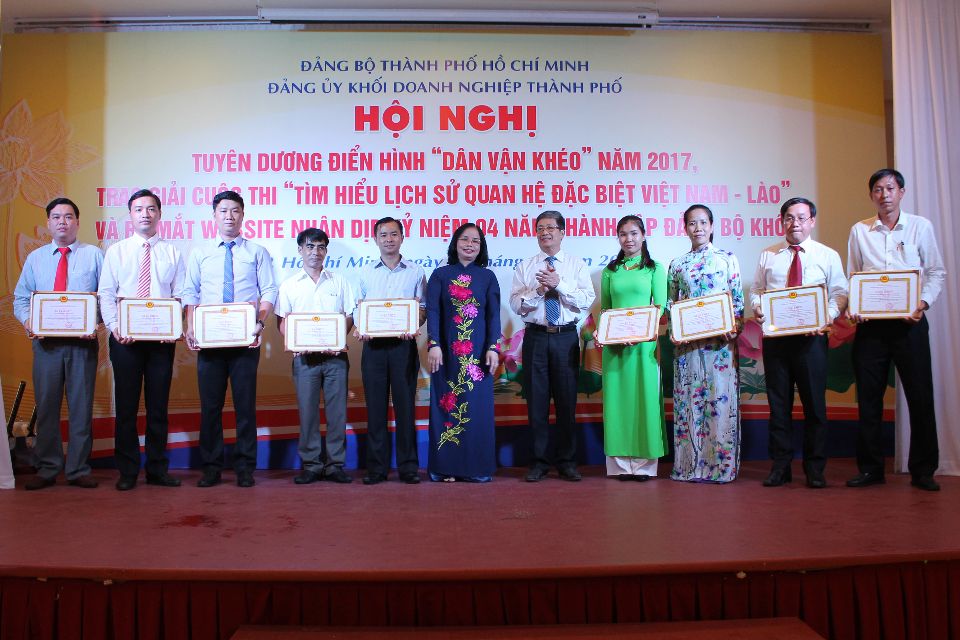 Nhằm thiết thực chào mừng kỷ niệm 87 năm Ngày Truyền thống công tác Dân vận của Đảng (15/10/1930 - 15/10/2017) và họp mặt 04 năm thành lập Đảng bộ Khối Doanh nghiệp Thành phố (08/10/2017 - 08/10/2017), ngày 12/10/2017, tại Hội trường Công ty Cổ phần Du lịch Hòa Bình Việt Nam, Đảng ủy Khối Doanh nghiệp đã tổ chức hội nghị tuyên dương điển hình “Dân vận khéo năm 2017”. Nhiều cá nhân, tập thể của Công ty TNHH MTV Thoát nước Đô thị Tp.HCM đã được vinh danh trong hội nghị. Điển hình là các tập thể: Chi bộ Thoát nước Đông Thành phố, Chi bộ Bình Hưng, Chi bộ Thoát nước Mưa và Đoàn Thanh niên Công ty. Các cá nhân được tuyên dương có anh Dương Tiến Dũng - Chi bộ Bắc Thành phố, anh Bùi Văn Trường - Chi bộ Thoát nước Mưa, anh Hoàng Hữu Hải - Chi bộ Bình Hưng, anh Vũ Quốc Khánh - Chi bộ Đông Thành phố.