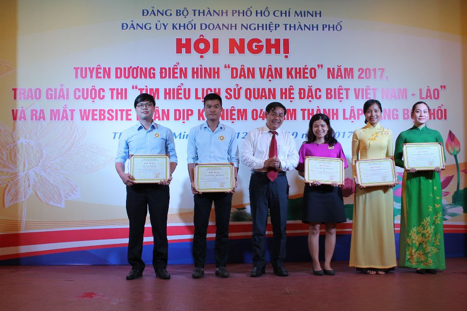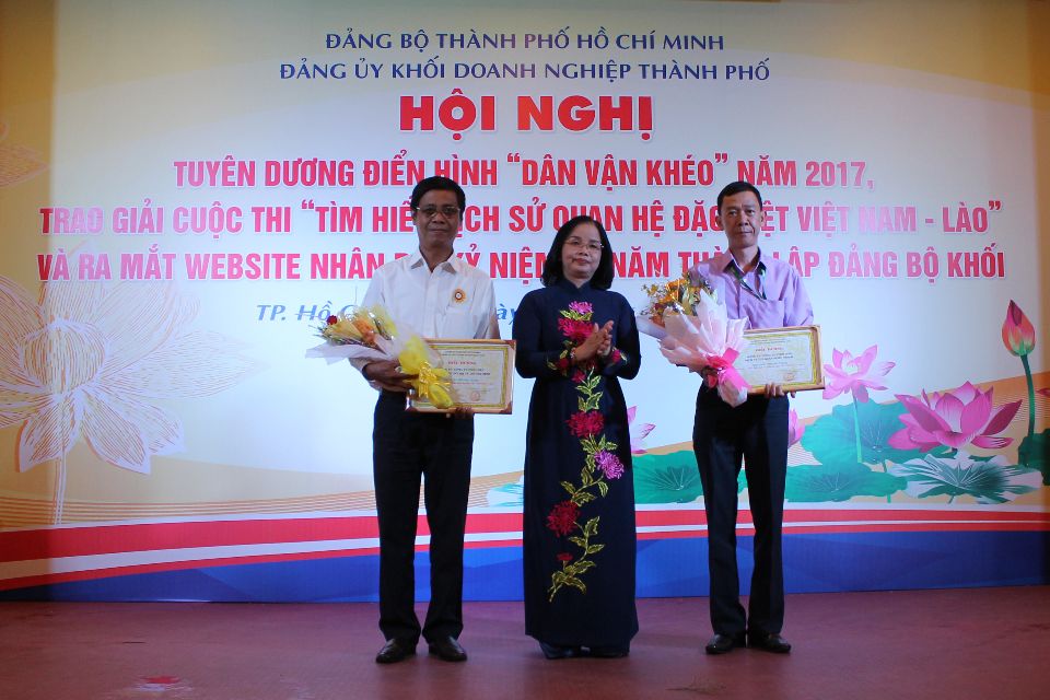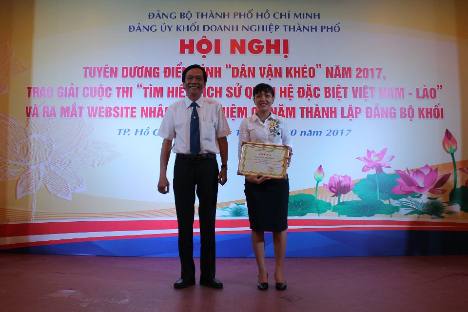 Trong khuôn khổ buổi hội nghị, các cá nhân, tập thể đạt giải cuộc thi “Tìm hiểu lịch sử quan hệ đặc biệt Việt Nam - Lào” cũng đã được biểu dương khen thưởng. Trong đó, 4 giải cá nhân đã thuộc về các anh chị CB.CNV của Công ty TNHH MTV Thoát nước Đô thị Tp.HCM là: chị Đoàn Thị Nhiệm - Chi bộ Thoát nước số 4 (Giải nhất), chị Lê Thị Thùy Trang - Chi bộ Bình Hưng (Giải ba), anh Nguyễn Đình Hưng và chị Hồ Thị Thủy Chung - Chi bộ Thoát nước số 4 (Giải khuyến khích). Giải phong trào của cuộc thi thuộc về tập thể Đảng ủy Công ty.