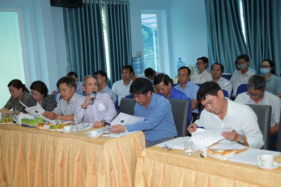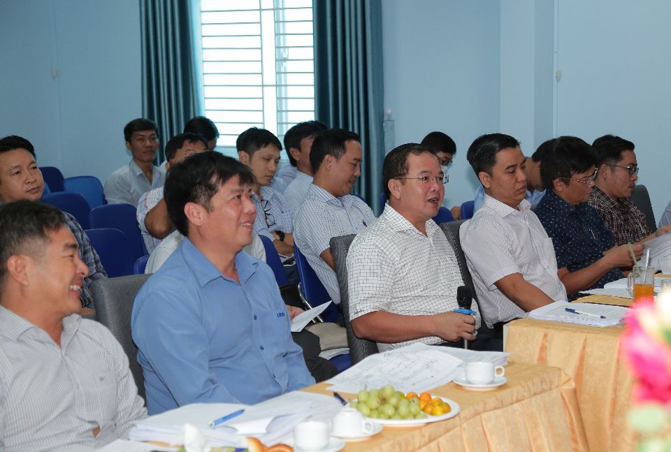Ông Nguyễn Hữu Phán (ngồi giữa), Phó Bí thư Đảng ủy - Giám đốc Công ty phát biểu trong buổi họp xét chọn sáng kiến cải tiến kỹ thuật năm 2022