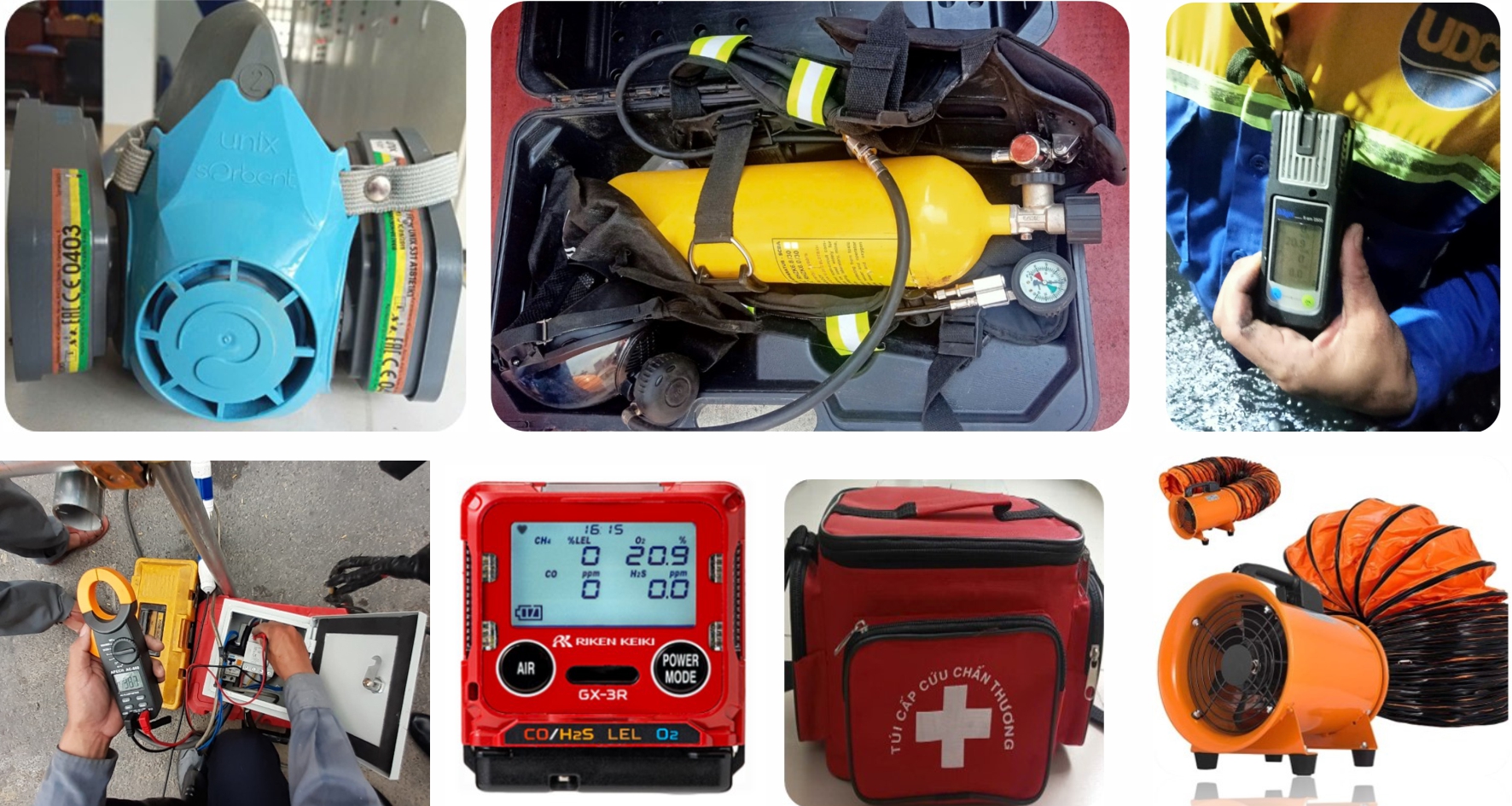 Tham gia khóa đào tạo, công nhân đã được hướng dẫn sử dụng thành thạo các dụng cụ bảo hộ cá nhân (PPE) và các trang thiết bị chuyên dụng, như: dây đai an toàn toàn thân, giá cứu hộ (Tripod), máy đo khí đa chỉ tiêu, mặt nạ phòng độc và bình dưỡng khí tự cứu, quy trình sơ cấp cứu và cứu nạn cứu hộ nhanh trong không gian hạn chế.