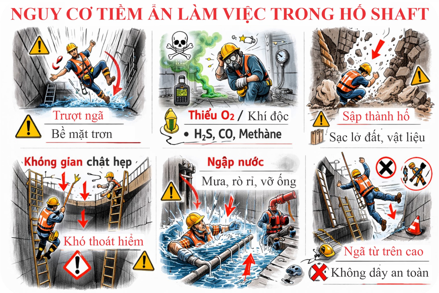 Buổi đào tạo tập trung vào kỹ năng làm việc tại hố Shaft – một trong những môi trường làm việc đặc thù và tiềm ẩn nhiều rủi ro cao trong ngành thoát nước. Nội dung chương trình bao gồm: nhận diện các nguy cơ gây mất an toàn trong môi trường thiếu oxy và tiềm ẩn nguy cơ té ngã do sạt lở đất, ngập lụt bất ngờ, dòng chảy xiết hoặc các sự cố liên quan đến thiết bị cơ điện. Các biện pháp kiểm soát và quy trình an toàn trước, trong và sau khi làm việc, như: kiểm tra hiện trường, đo nồng độ khí độc bằng thiết bị chuyên dụng, thiết lập rào chắn và biển báo, duy trì thông tin liên lạc giữa người bên dưới và người trực trên mặt đất, sử dụng hệ thống thông gió, thu dọn hiện trường, kiểm tra số lượng nhân sự và thiết bị trước khi hoàn tất ca làm việc... là những yêu cầu quan trọng và cần thiết nhằm đảm bảo an toàn cho người lao động làm việc trong môi trường có tính chất nguy hiểm, đặc thù như hố shaft.