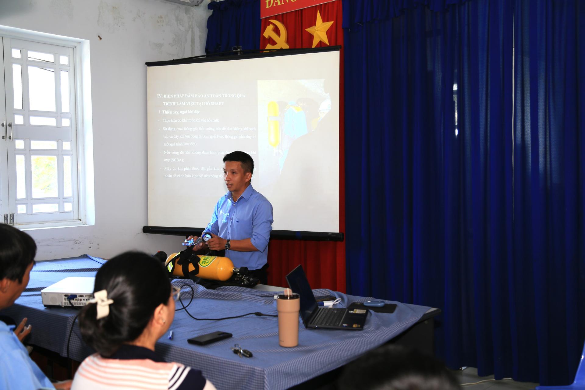 Ông Dương Phụng Tuấn, nhân viên Xí nghiệp VHHTTNT Phú Lâm trình bày thao tác sử dụng thiết bị tại buổi đào tạo an toàn lao động