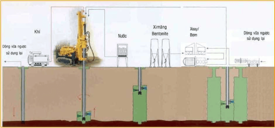 Công tác khoan thực hiện bằng công nghệ khoan xoay và xói nước bằng tia thẳng đứng (phân biệt với cơ chế phụt vữa: tia vữa đi ra theo phương nằm ngang), sử dụng loại cần khoan và mũi khoan chuyên dụng (1).