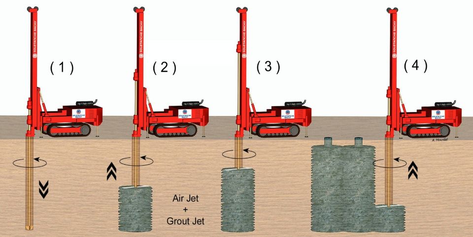 Sau khi đưa mũi khoan đến cao độ thiết kế, quá trình phụt vữa bắt đầu. Vữa được phụt qua lỗ phun nằm ở bên thành mũi khoan. Áp suất và vận tốc cao của tia vữa làm phá vỡ kết cấu của đất, và tạo thành thể đất- xi măng. Nhiều kết cấu và kích thước hình học có thể đạt được bằng cách thay đổi các chỉ tiêu phun (2).